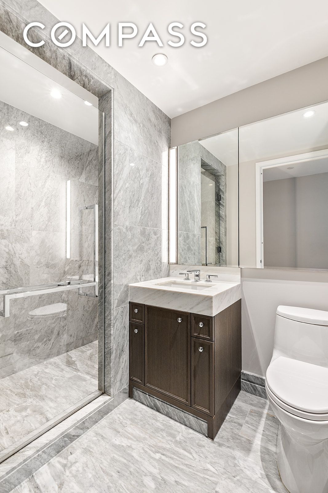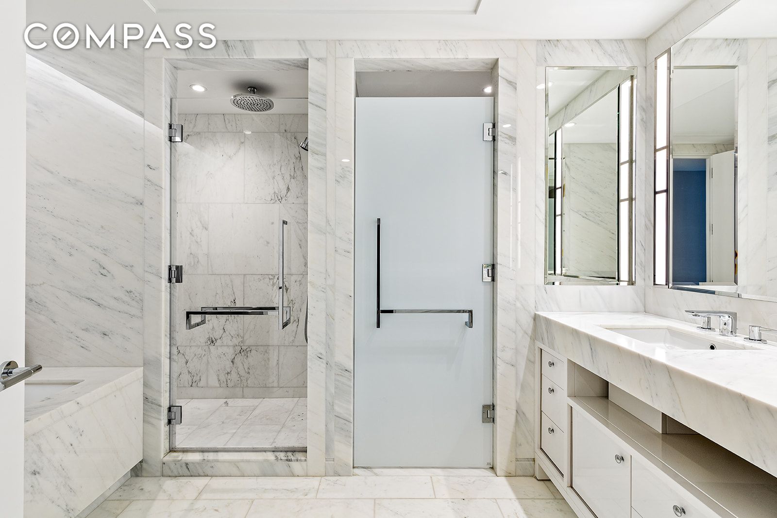 All three bedrooms feature en-suite baths and excellent closet space, including a large walk-in closet in the primary suite and an oversized walk-in in bedroom three. The primary bath is a luxurious retreat with radiant heated floors, deep soaking tub, glass-enclosed shower with marble bench, and dual vanity. A chic powder room off the entry completes the home.