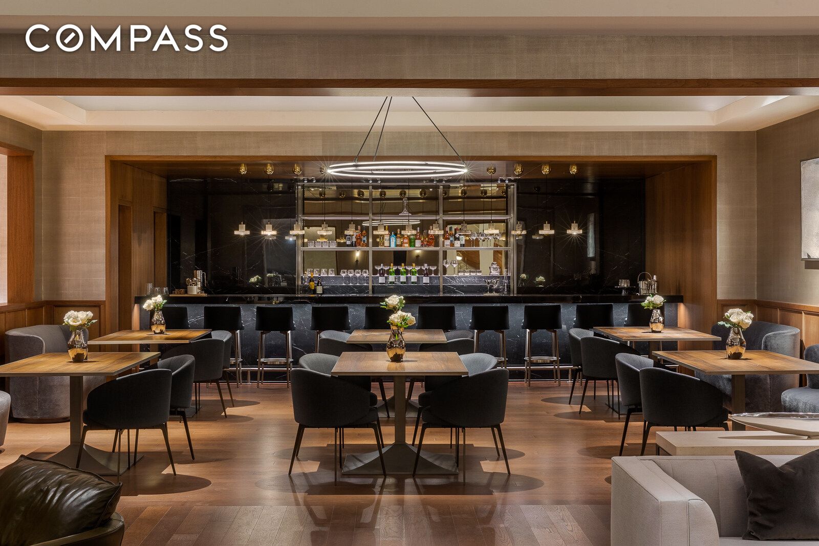 The open-concept kitchen and living area is ideal for entertaining, featuring floor-to-ceiling windows, a spacious island with seating for five, and excellent storage including dual pull-out pantries. Outfitted with sleek Pedini cabinetry, Gaggenau appliances, wine fridge, and a vented range hood, the kitchen is both stylish and functional. A generous alcove just off the kitchen makes the perfect home office or library nook.